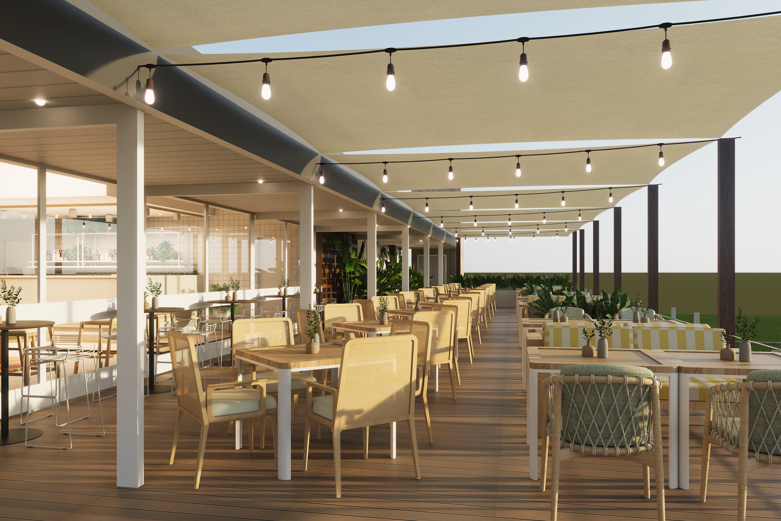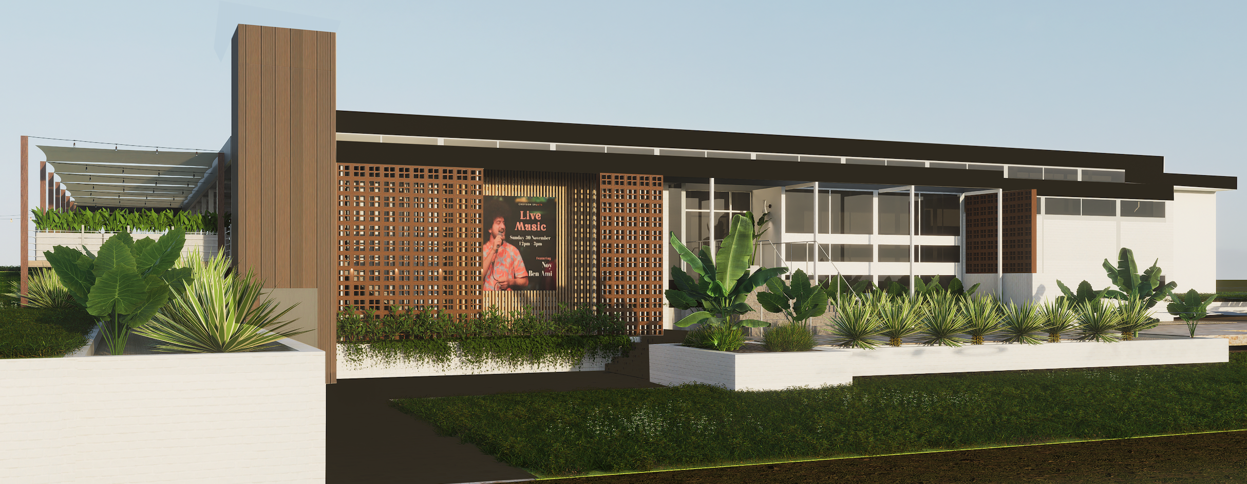 The project involved revitalising an ageing mid century club building and repositioning it as a more attractive, commercially resilient hospitality destination. The existing facade and arrival experience lacked presence, accessibility was limited, and dining offer was constrained by inflexible indoor areas and under-utilised outdoor space. The client required a practical, cost conscious upgrade that could expand dining options, improve inclusivity, and support year round trade, all without major structural works or operational disruption.