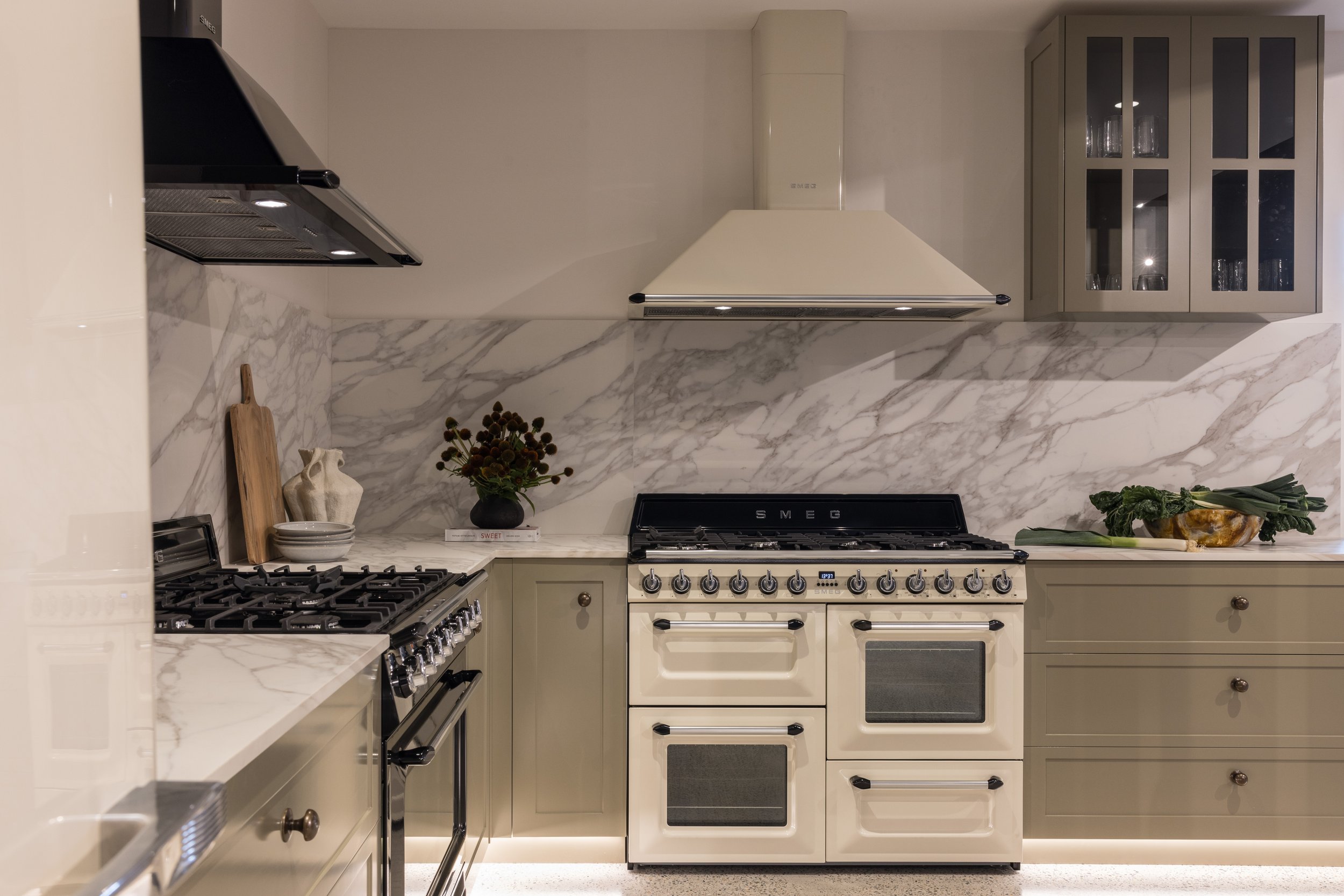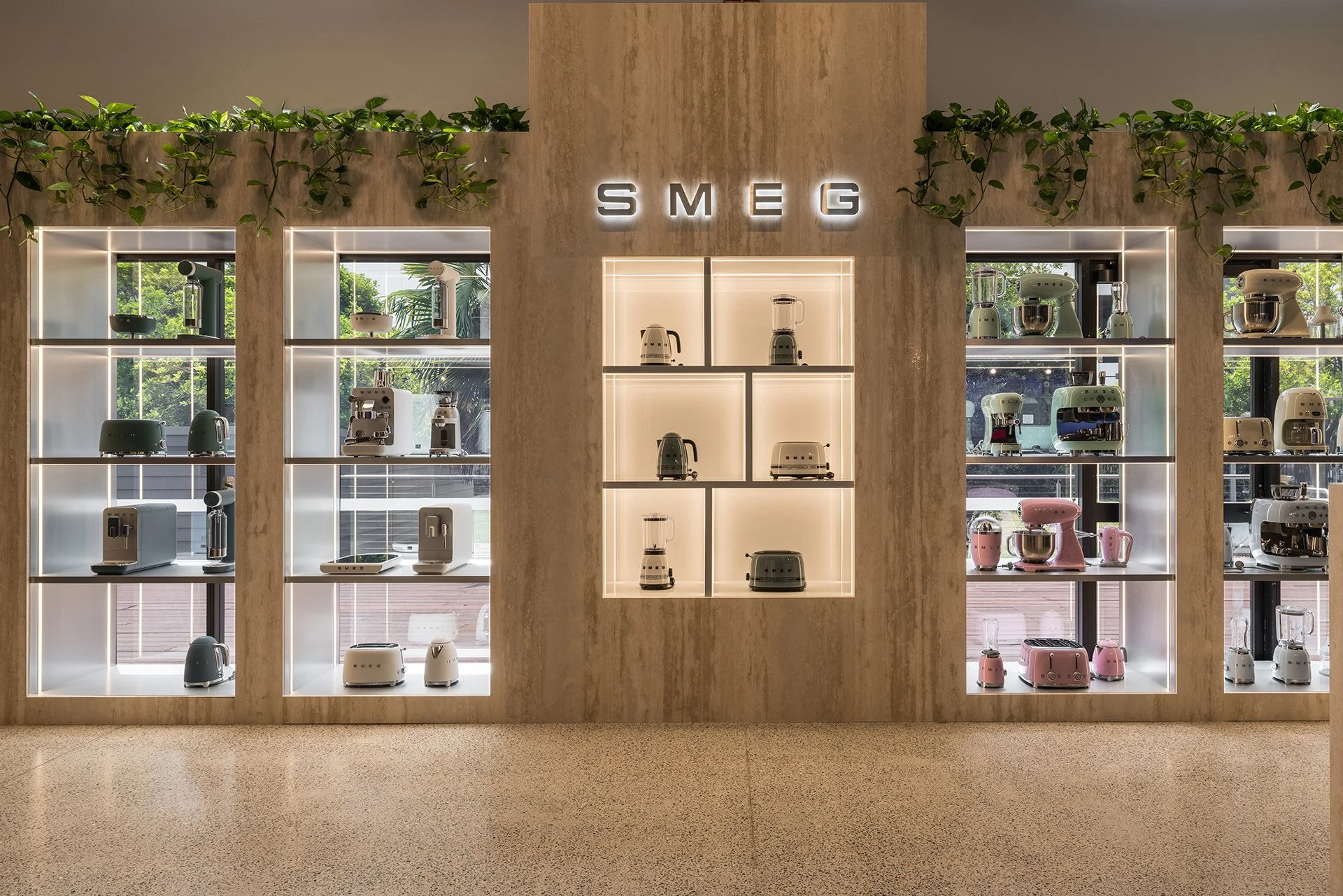 Travertine lines the walls and joinery, its Italian origin echoing and honouring Smeg’s heritage.
