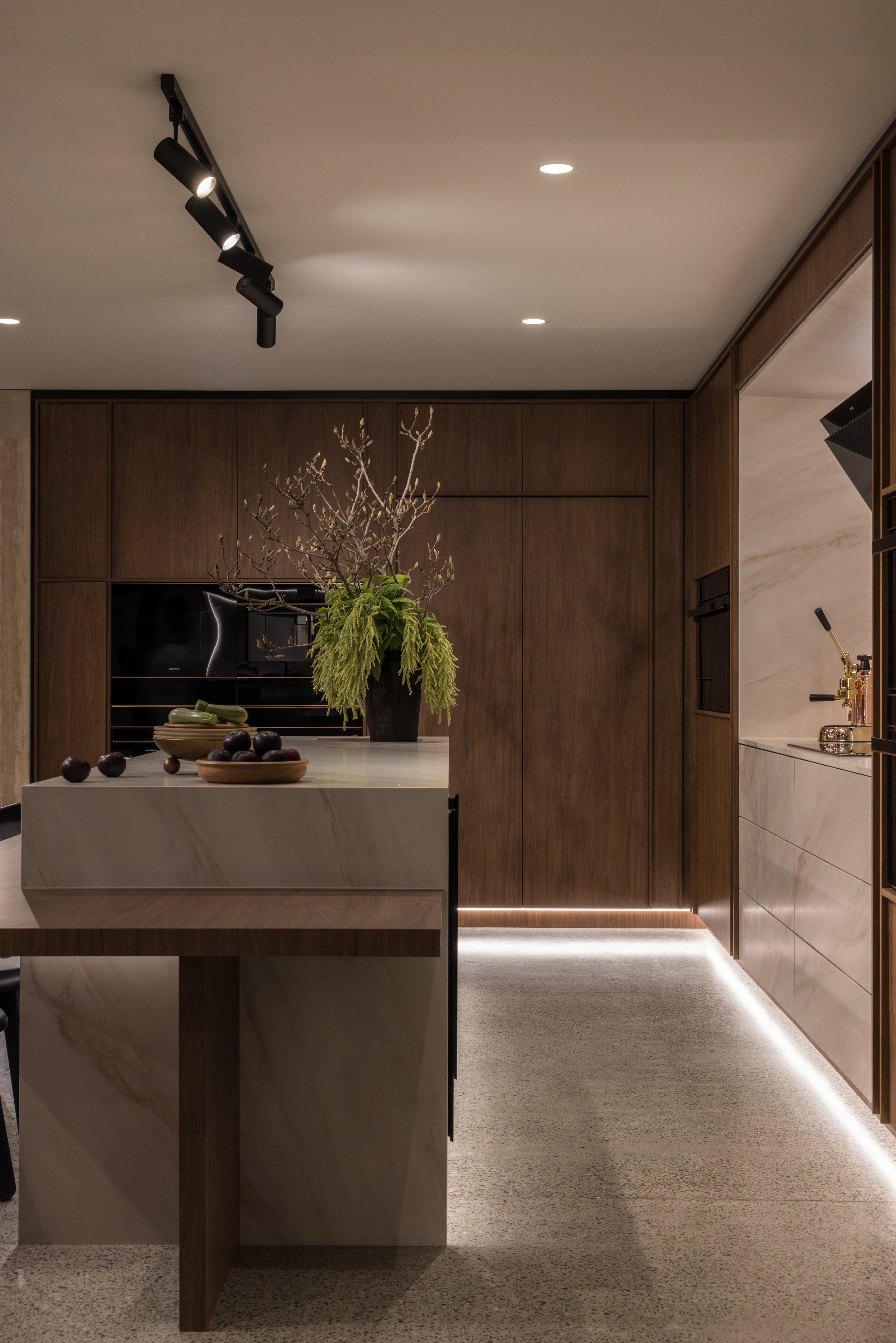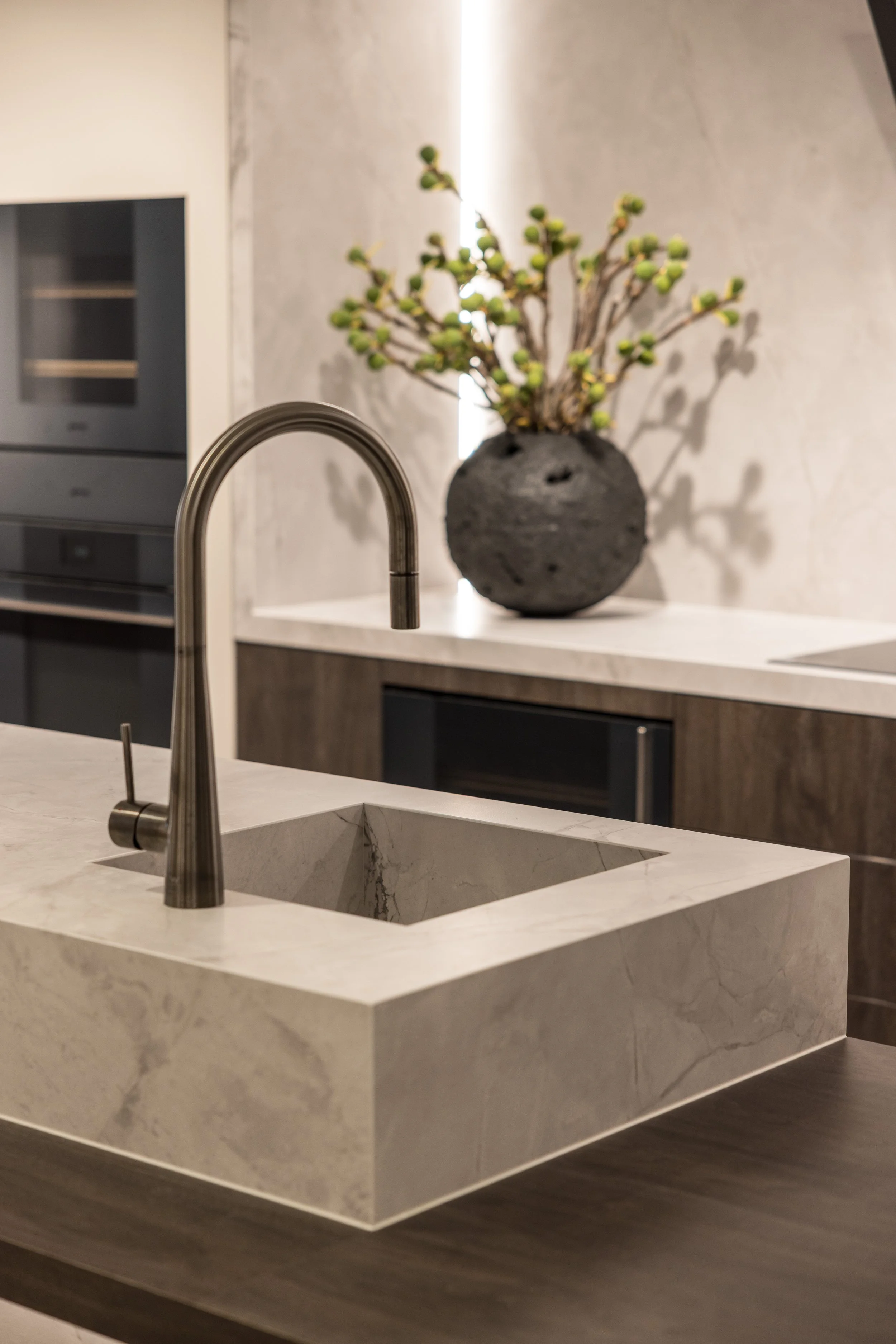The small appliances are displayed like works of art in a custom travertine joinery unit.