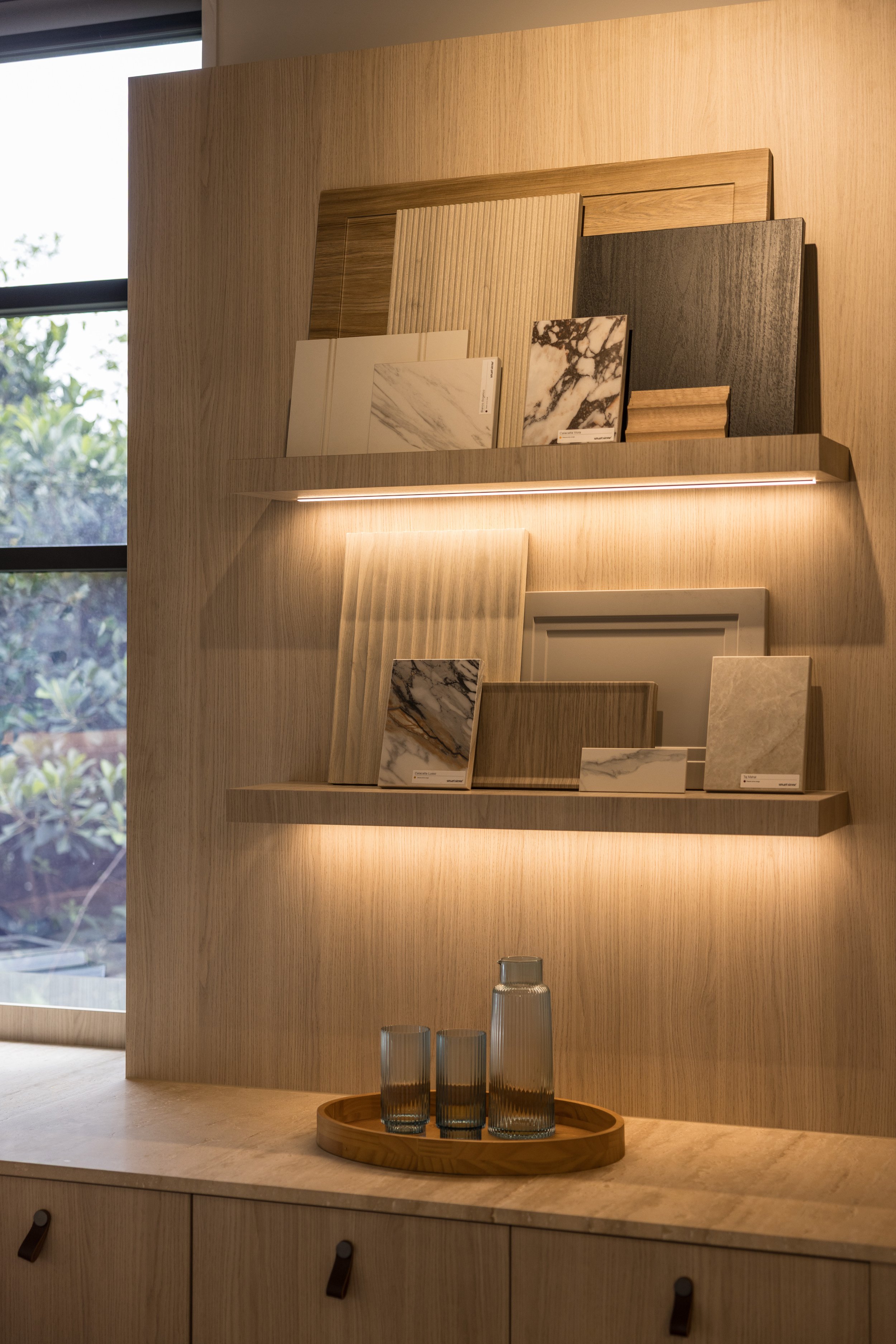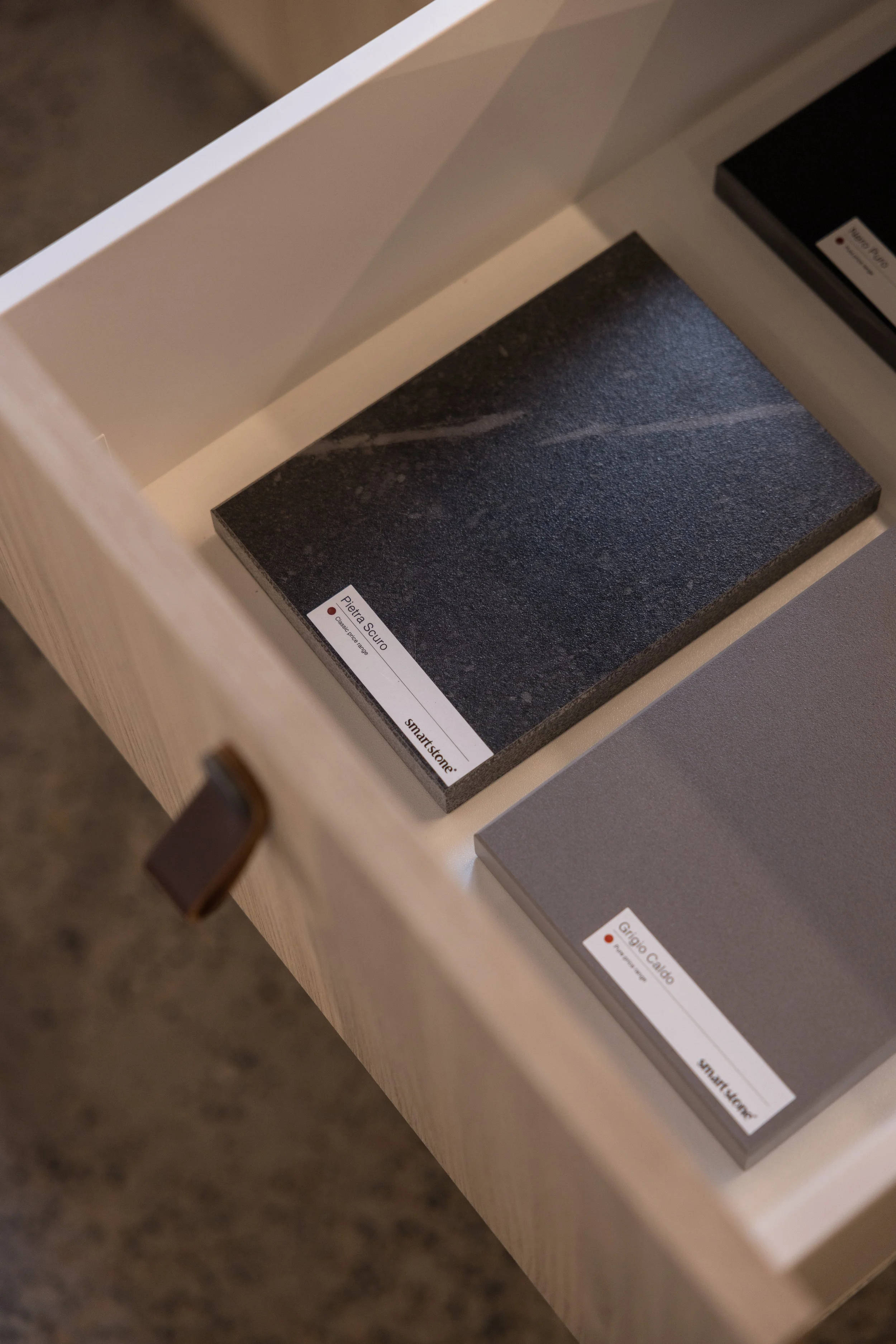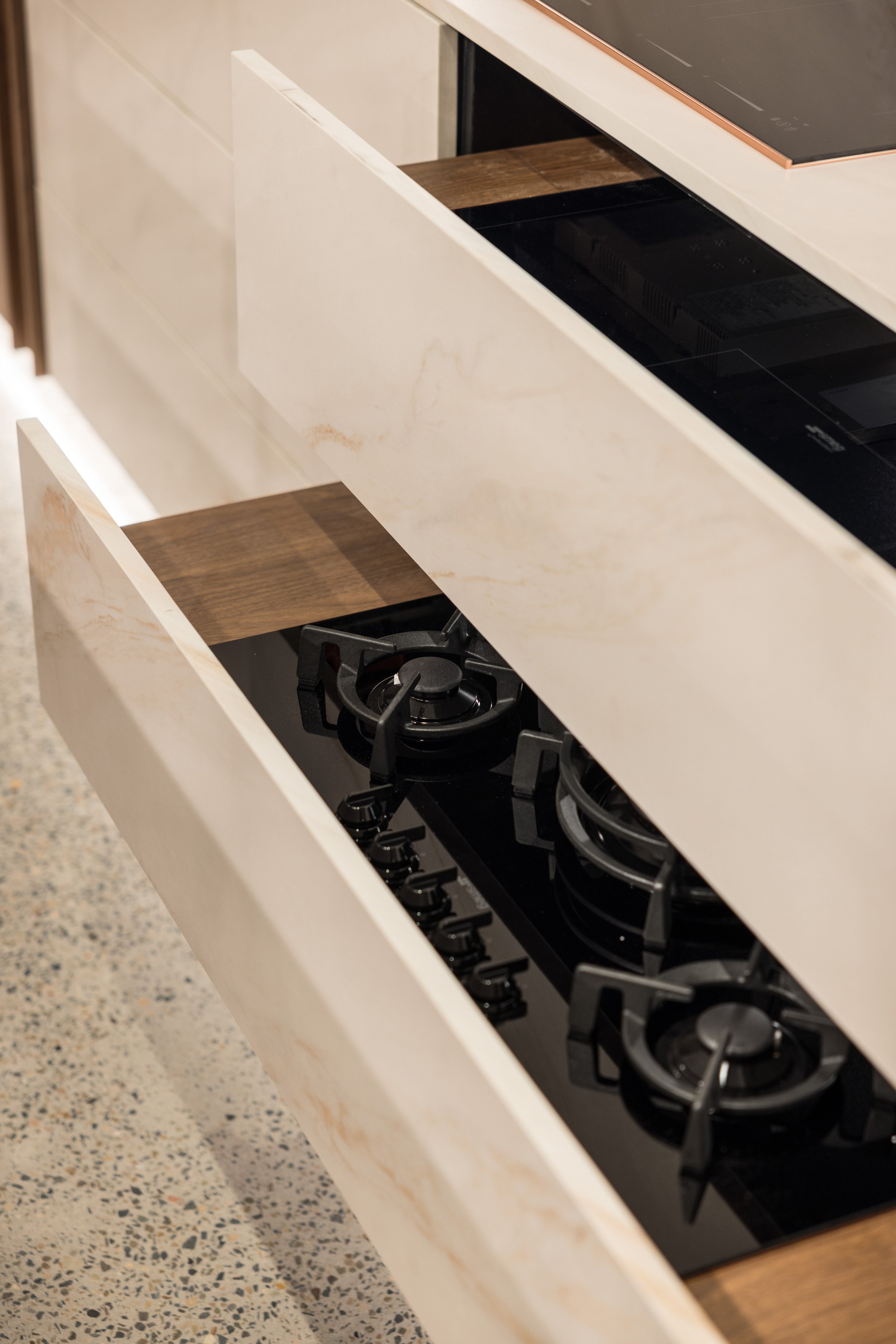 Finishes including stone, laminate, timber etc in drawers, to showcase against Smeg products.