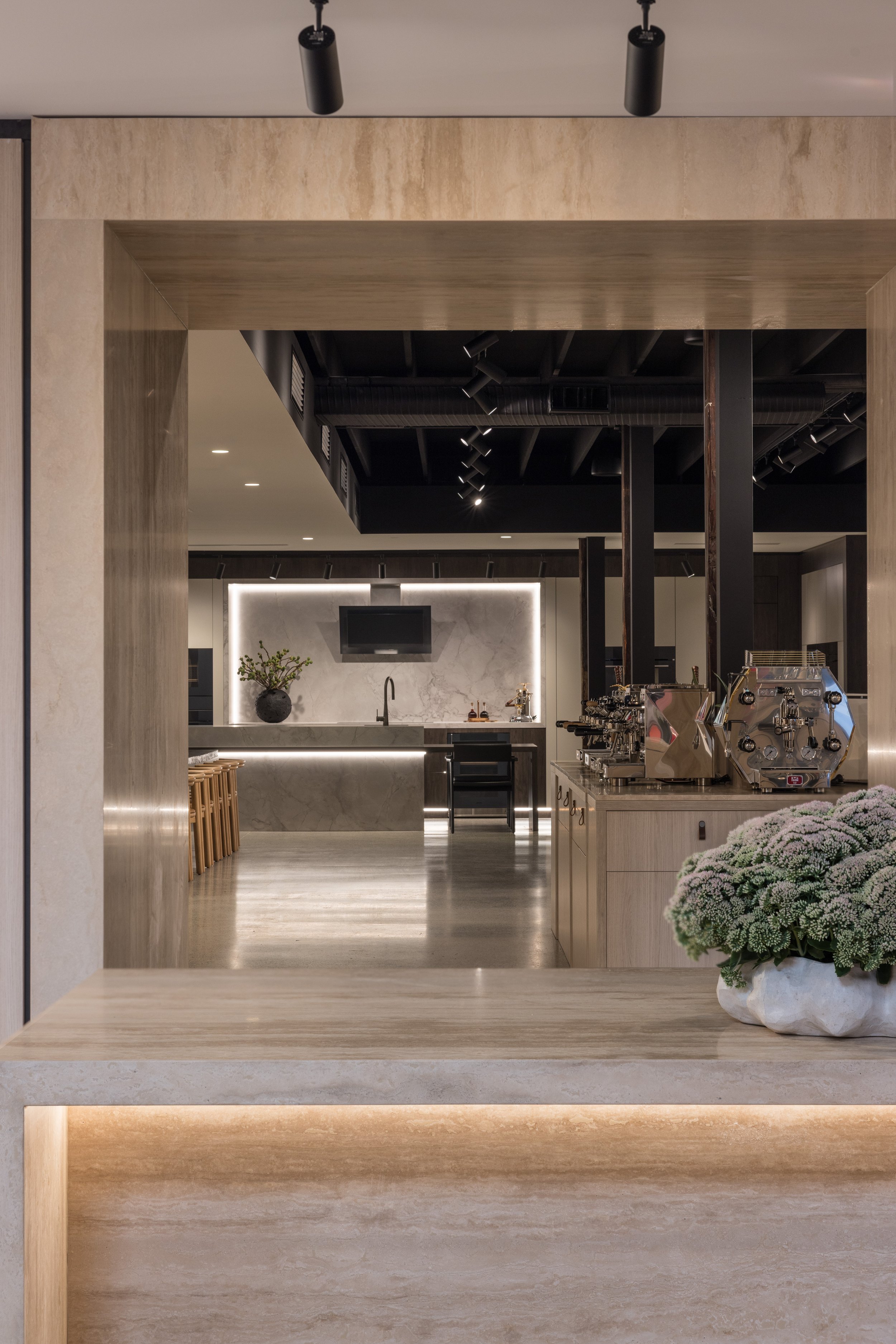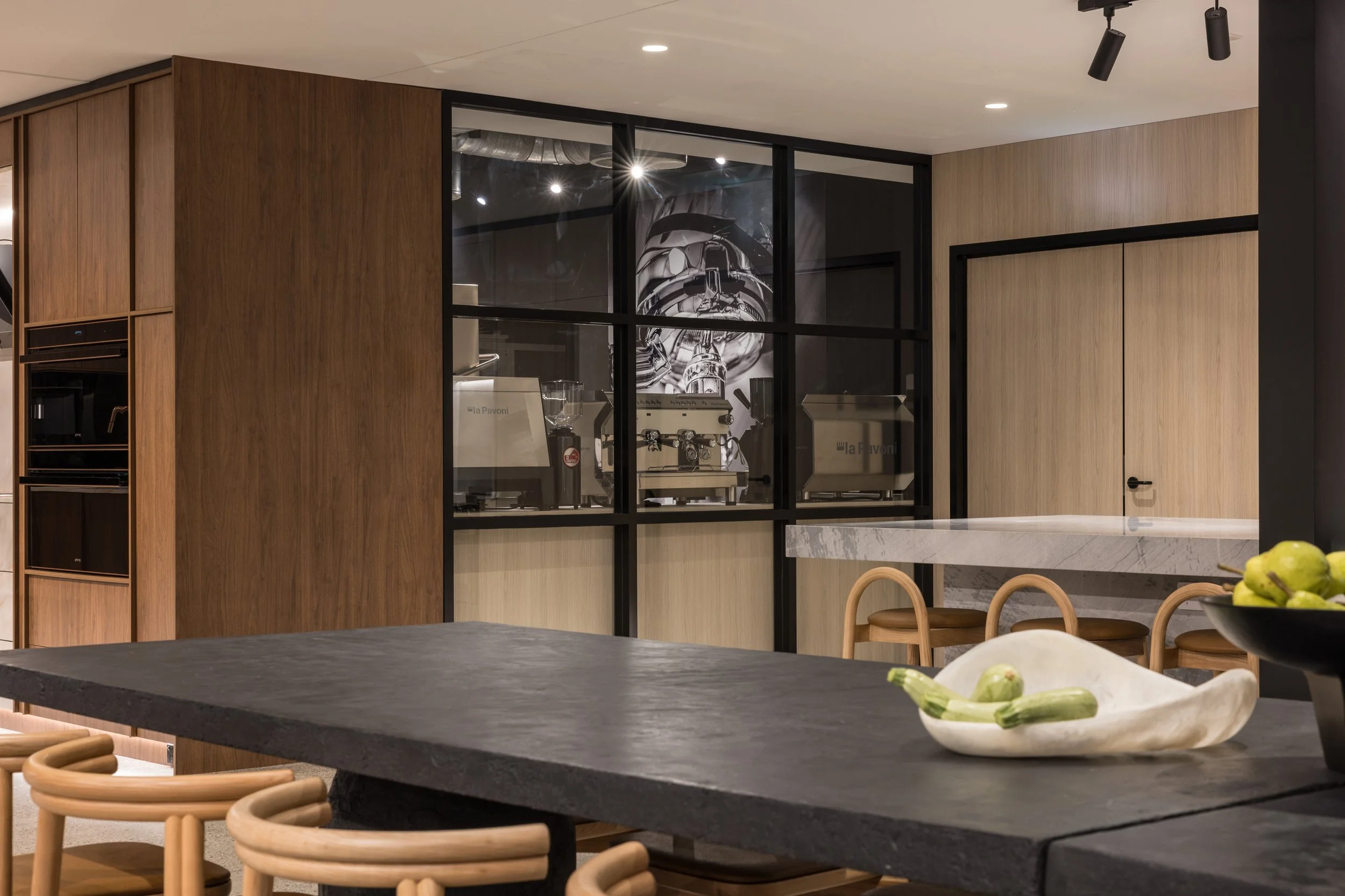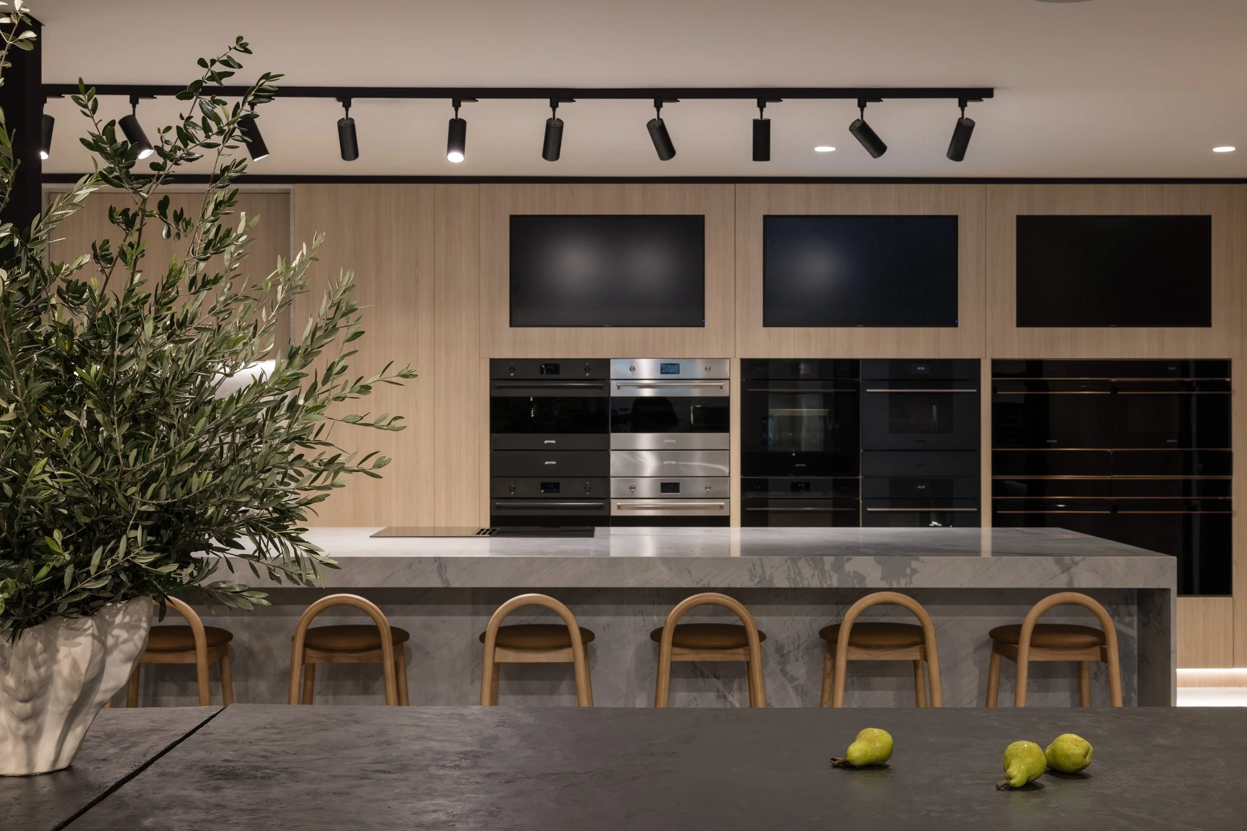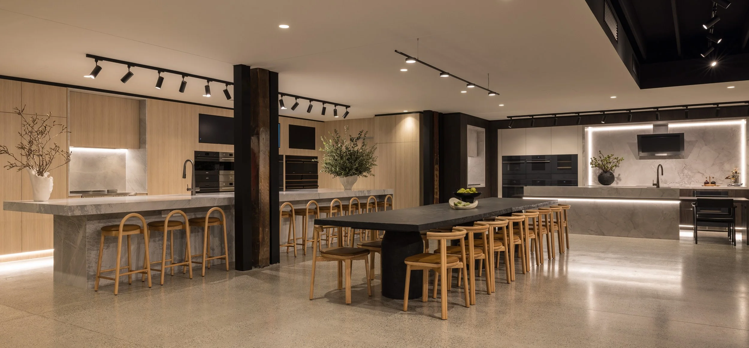 Our approach to this commercial interior design and retail showroom project in Sydney was grounded in strategic planning, beginning with stakeholder workshops, customer journey mapping and international benchmarking to shape a highly considered and immersive retail environment. The showroom is organised around a central demonstration kitchen that forms the heart of the space, designed to engage the senses, build trust and inspire customers through live product interaction. Each product range is expressed as a distinct kitchen showroom environment, carefully designed to reflect its individual aesthetic and lifestyle, enabling customers to clearly envision the products within their own homes. Additional appliances are seamlessly integrated through concealed storage solutions, ensuring a refined and premium presentation without compromising range depth. The design responds to the heritage context by retaining and celebrating original timber columns, exposed ceilings and existing materials, while travertine and layered lighting reinforce Smeg’s Italian design language. A considered zoning strategy supports multiple user groups, including a design studio, developer suite and commercial display areas, while flexible elements such as a custom 16-seat table made from reclaimed materials enable adaptability. Sustainability is embedded through adaptive reuse, material repurposing and long-life material selection, resulting in a retail showroom design that is both inspiring, functional and enduring.