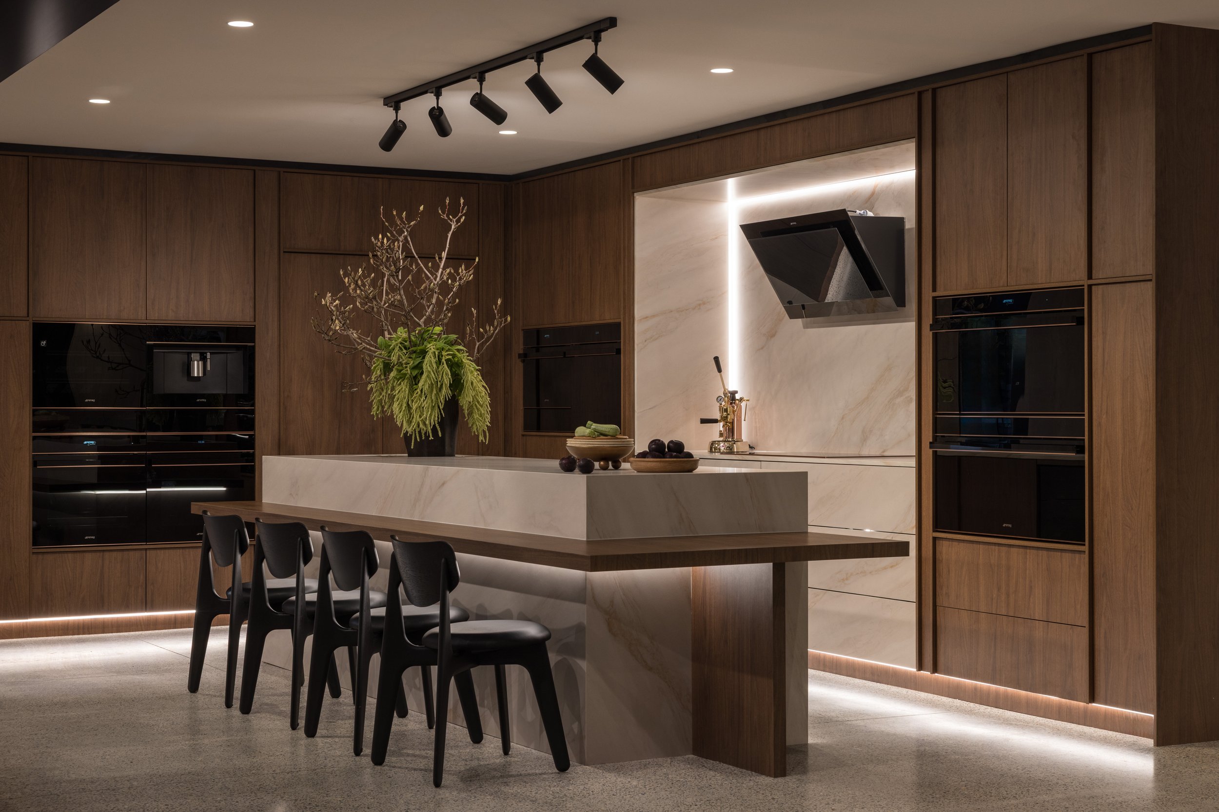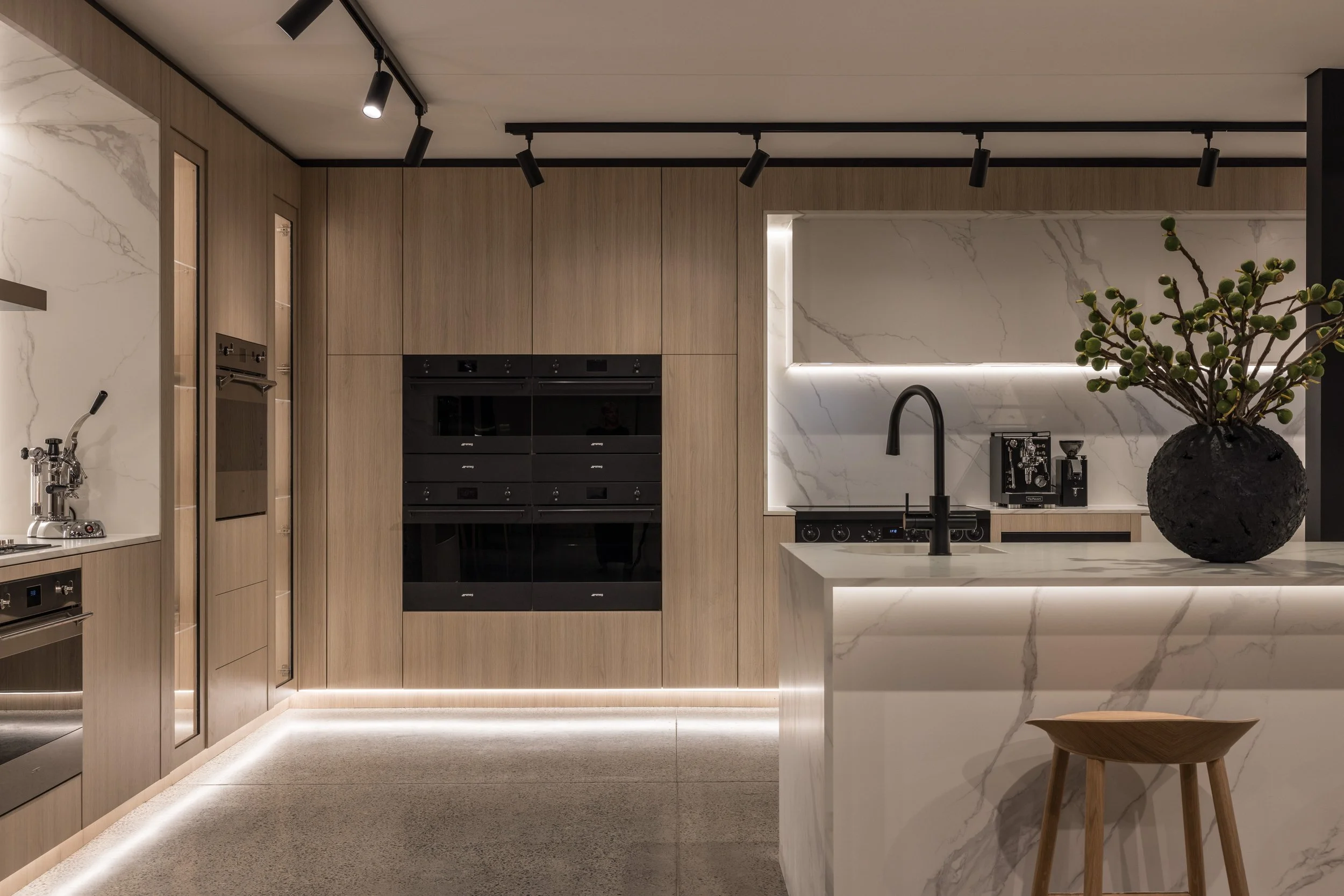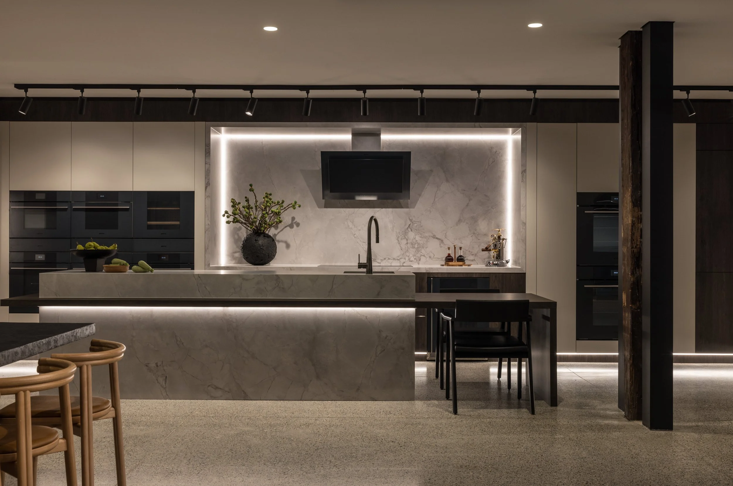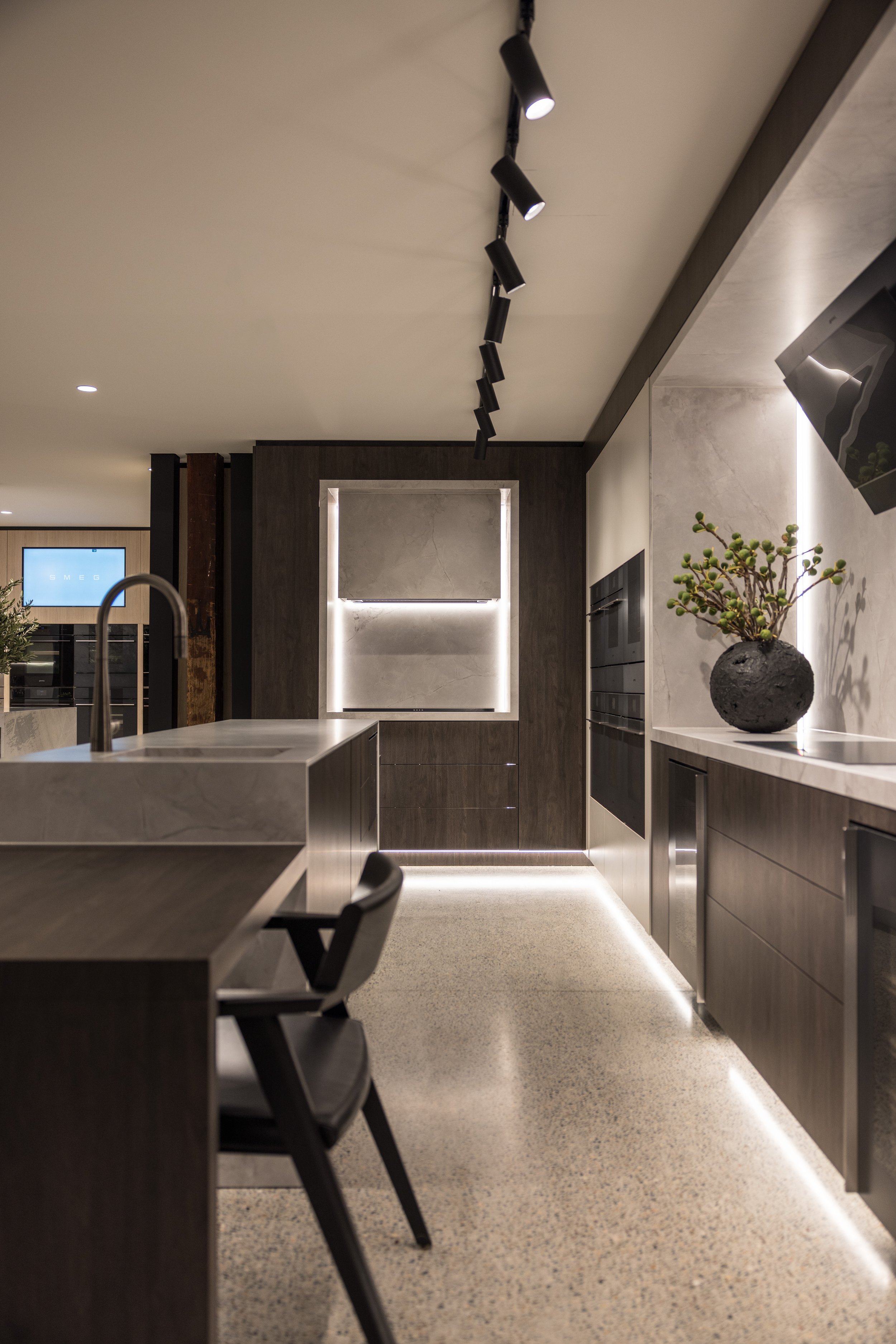 Our approach to this commercial interior design and retail showroom project in Sydney was grounded in strategic planning, beginning with stakeholder workshops, customer journey mapping and international benchmarking to shape a highly considered and immersive retail environment. The showroom is organised around a central demonstration kitchen that forms the heart of the space, designed to engage the senses, build trust and inspire customers through live product interaction. Each product range is expressed as a distinct kitchen showroom environment, carefully designed to reflect its individual aesthetic and lifestyle, enabling customers to clearly envision the products within their own homes. Additional appliances are seamlessly integrated through concealed storage solutions, ensuring a refined and premium presentation without compromising range depth. The design responds to the heritage context by retaining and celebrating original timber columns, exposed ceilings and existing materials, while travertine and layered lighting reinforce Smeg’s Italian design language. A considered zoning strategy supports multiple user groups, including a design studio, developer suite and commercial display areas, while flexible elements such as a custom 16-seat table made from reclaimed materials enable adaptability. Sustainability is embedded through adaptive reuse, material repurposing and long-life material selection, resulting in a retail showroom design that is both inspiring, functional and enduring.