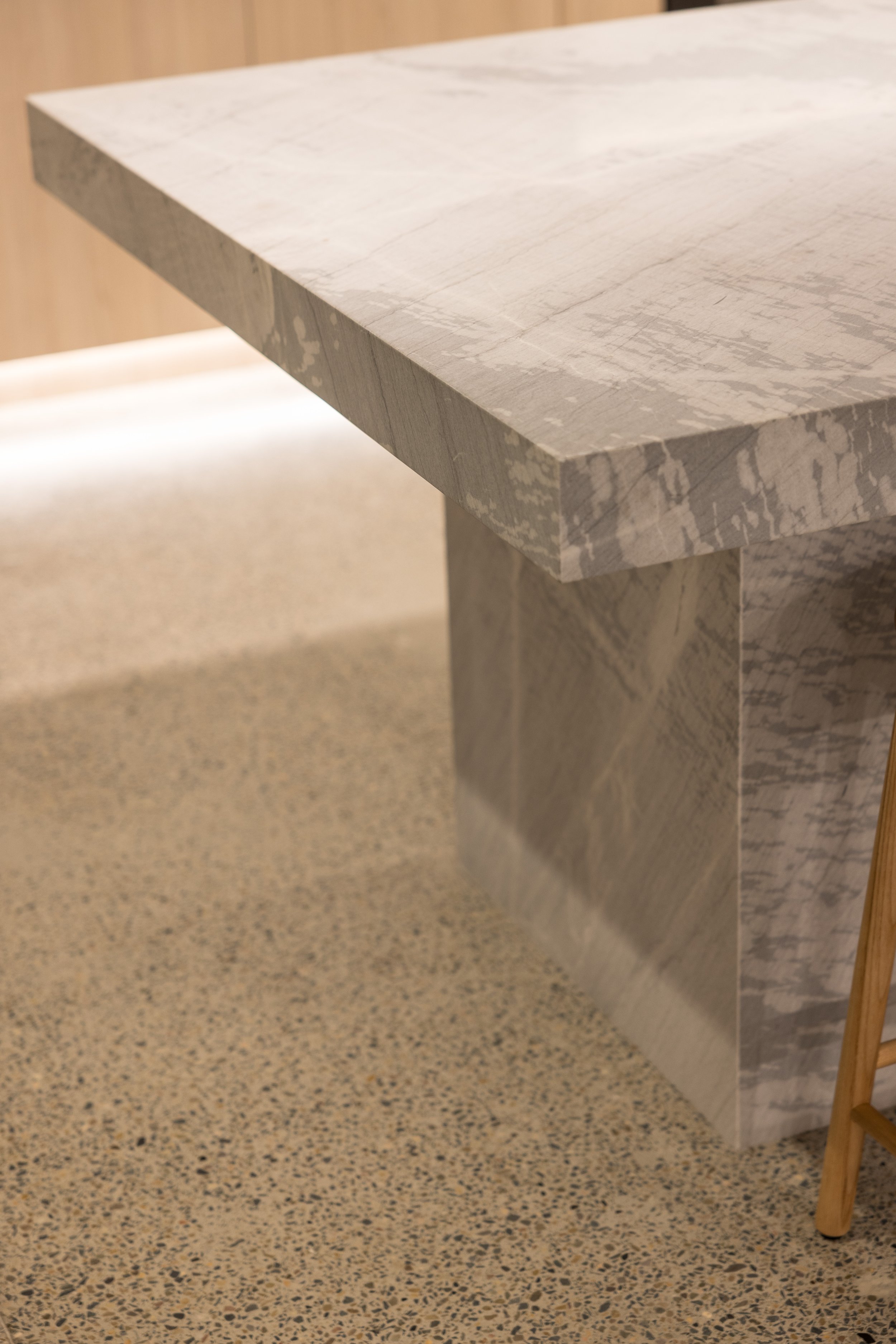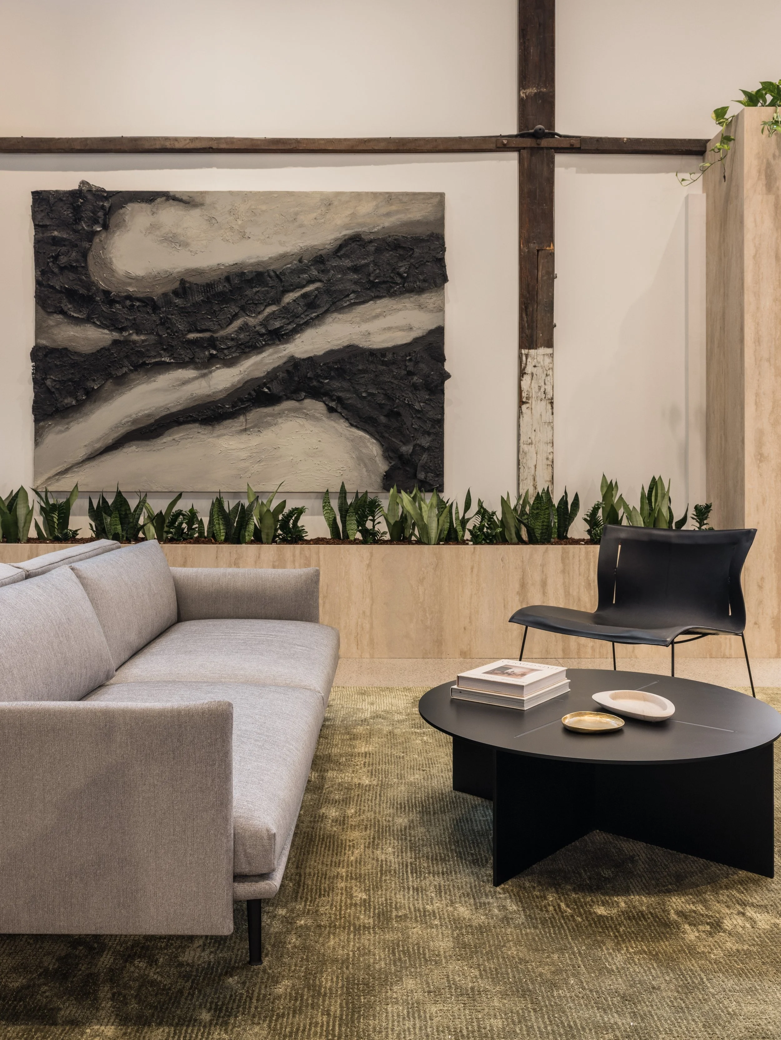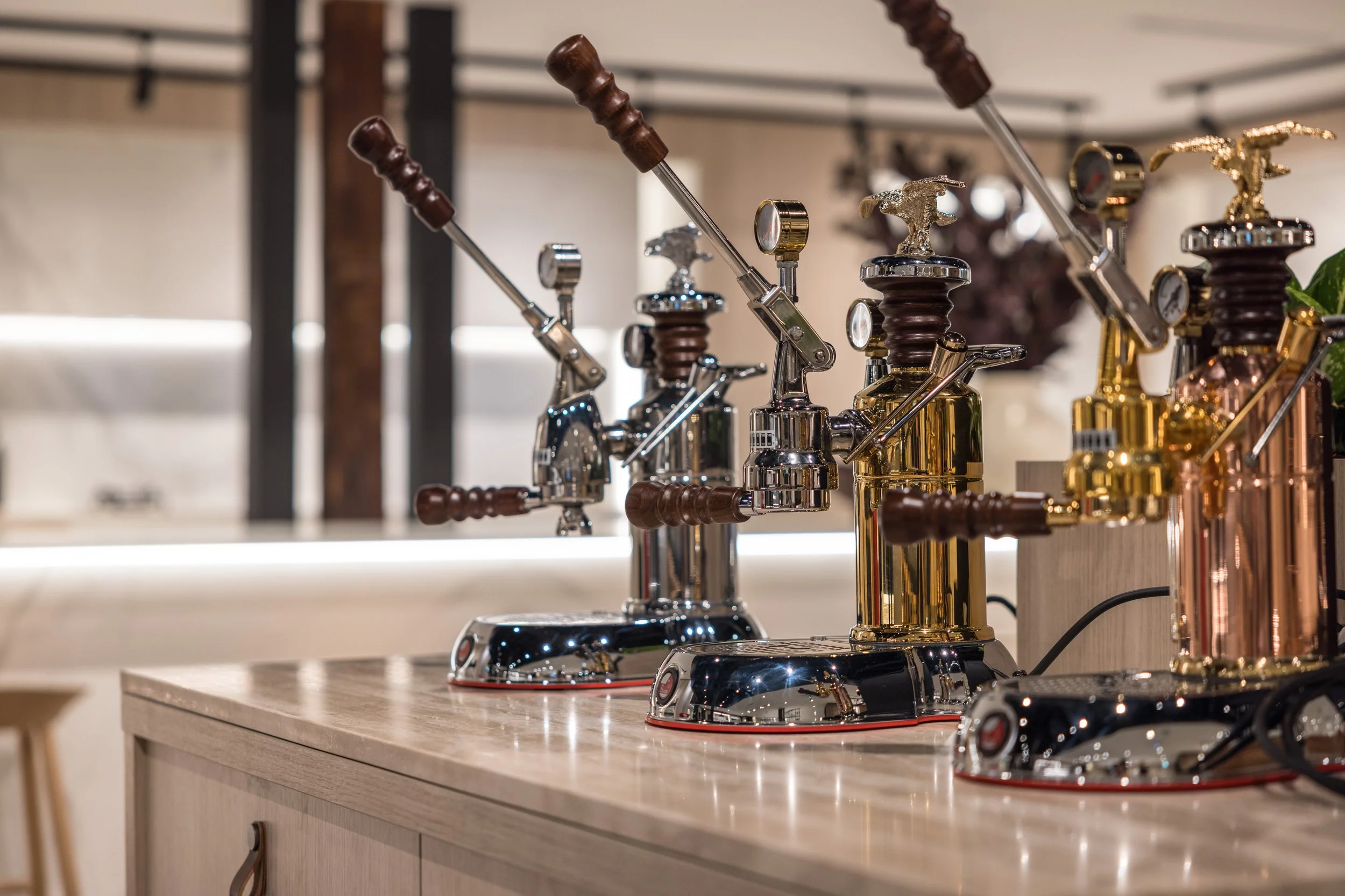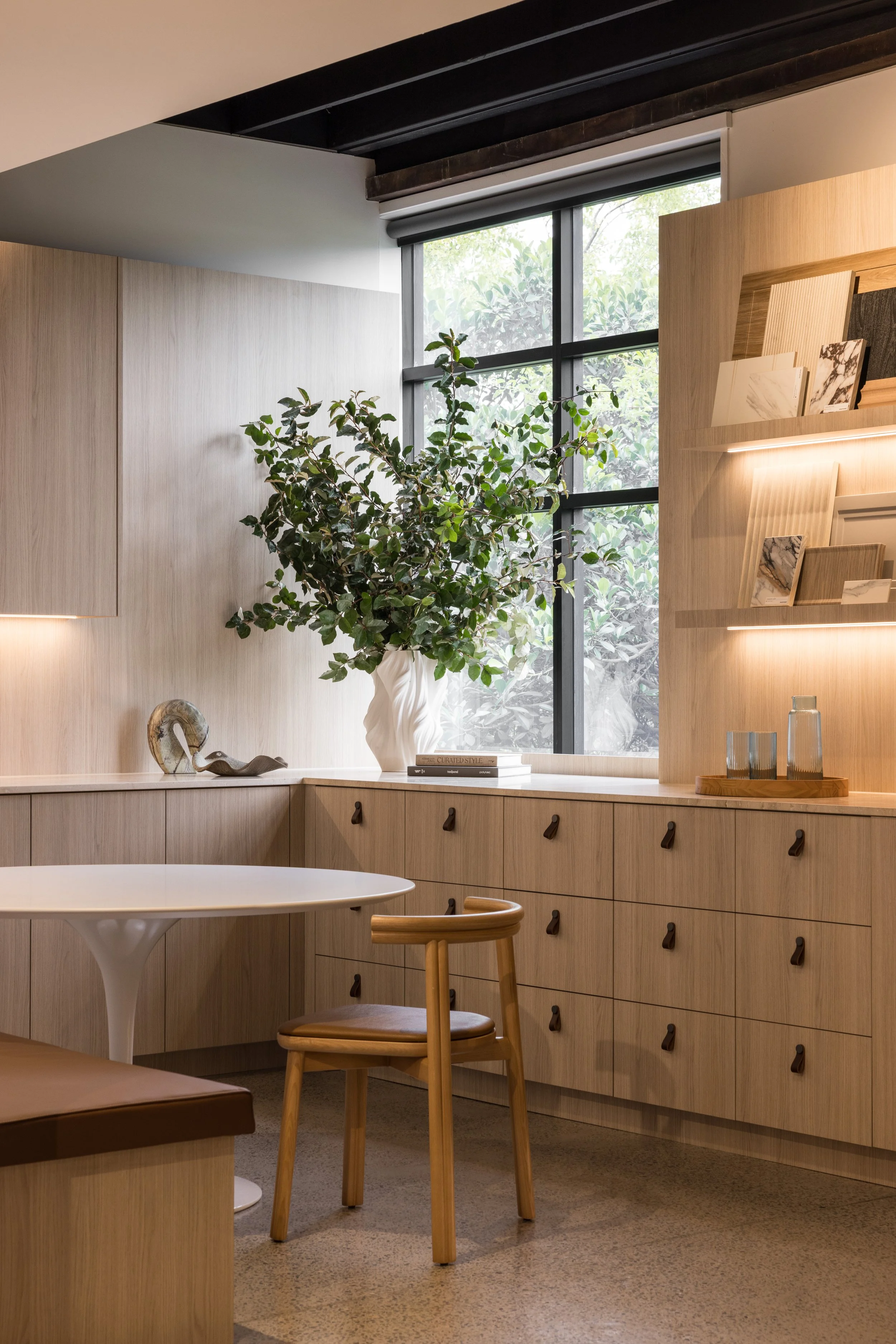 Our approach to this commercial interior design and retail showroom project in Sydney was grounded in strategic planning, beginning with stakeholder workshops, customer journey mapping and international benchmarking to shape a highly considered and immersive retail environment. The showroom is organised around a central demonstration kitchen that forms the heart of the space, designed to engage the senses, build trust and inspire customers through live product interaction. Each product range is expressed as a distinct kitchen showroom environment, carefully designed to reflect its individual aesthetic and lifestyle, enabling customers to clearly envision the products within their own homes. Additional appliances are seamlessly integrated through concealed storage solutions, ensuring a refined and premium presentation without compromising range depth. The design responds to the heritage context by retaining and celebrating original timber columns, exposed ceilings and existing materials, while travertine and layered lighting reinforce Smeg’s Italian design language. A considered zoning strategy supports multiple user groups, including a design studio, developer suite and commercial display areas, while flexible elements such as a custom 16-seat table made from reclaimed materials enable adaptability. Sustainability is embedded through adaptive reuse, material repurposing and long-life material selection, resulting in a retail showroom design that is both inspiring, functional and enduring.
