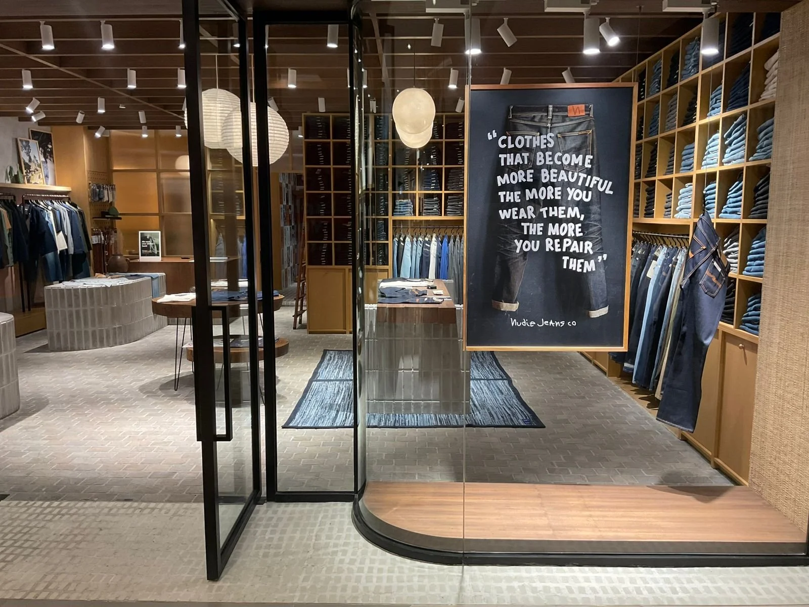 The store design was inspired by the brand's core belief: “Clothes become more beautiful the more you wear them. The more you repair them.” This retail space reflects Nudie Jeans’ dedication to create tomorrow’s vintage, with a design that embraces the Japanese philosophy of wabi-sabi—finding beauty in transience and imperfection. The store’s design draws heavily on sustainable principles, emphasising warm, natural textures, earthy tones, and locally sourced materials. In line with Nudie Jeans’ mission to reduce waste and promote conscious consumption, the repair station is constructed from recycled bricks made from local rejected plastic waste. This innovative material is incorporated throughout the space, used on the display tables, POS desk, and even on the floors for the rear fitting rooms and experiential area.