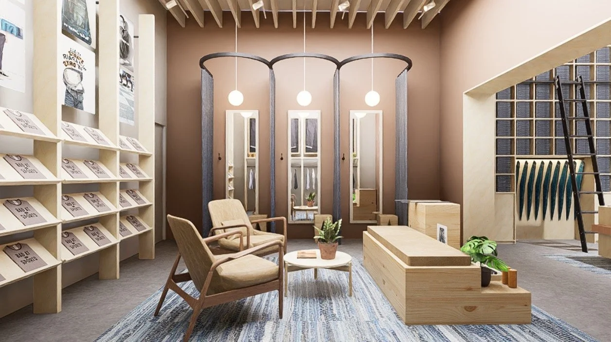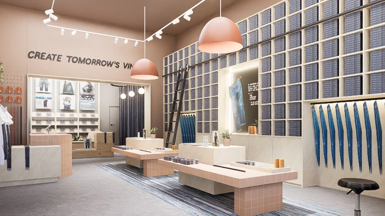 Anchored in Nudie Jeans’ ongoing commitment to sustainability, the design continues to push the boundaries of circular material use. For this store, unusable traded-in denim and sand waste were transformed into custom tiles, featured across the sewing table, display tables and point of sale. These tactile surfaces give new life to discarded materials, turning waste into a refined design feature that expresses the brand’s values through texture and craft.