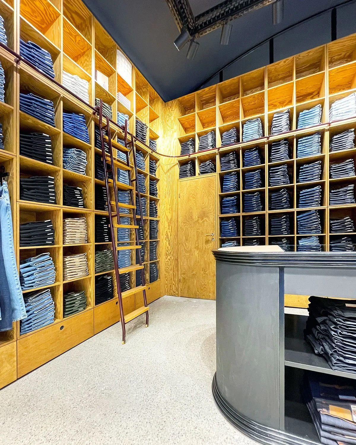 Sustainability is at the core of the brand and to reflect this, repurposed elements, sustainable finishes and a sewing machine is built into the store offering customers forever repairs.