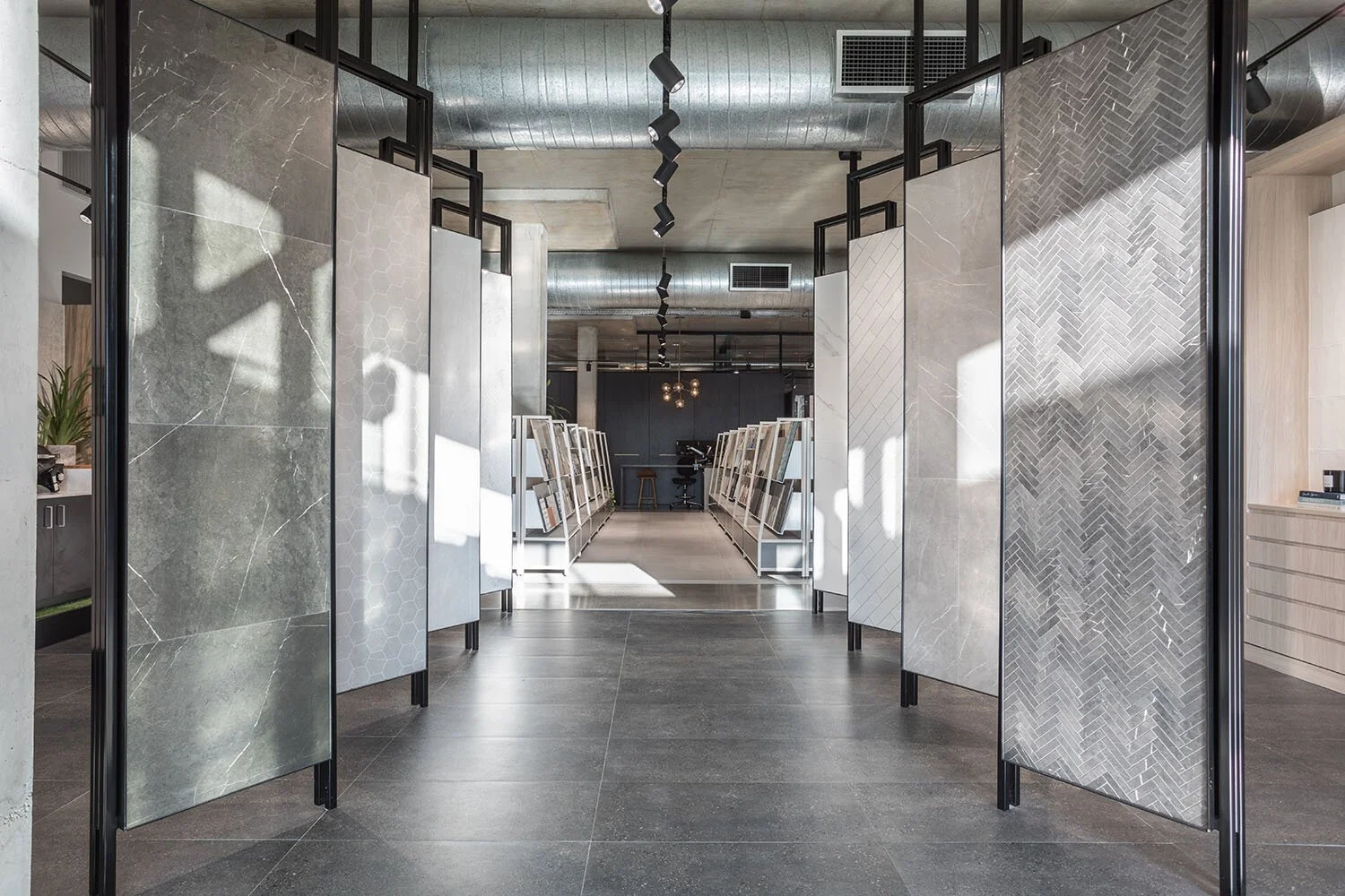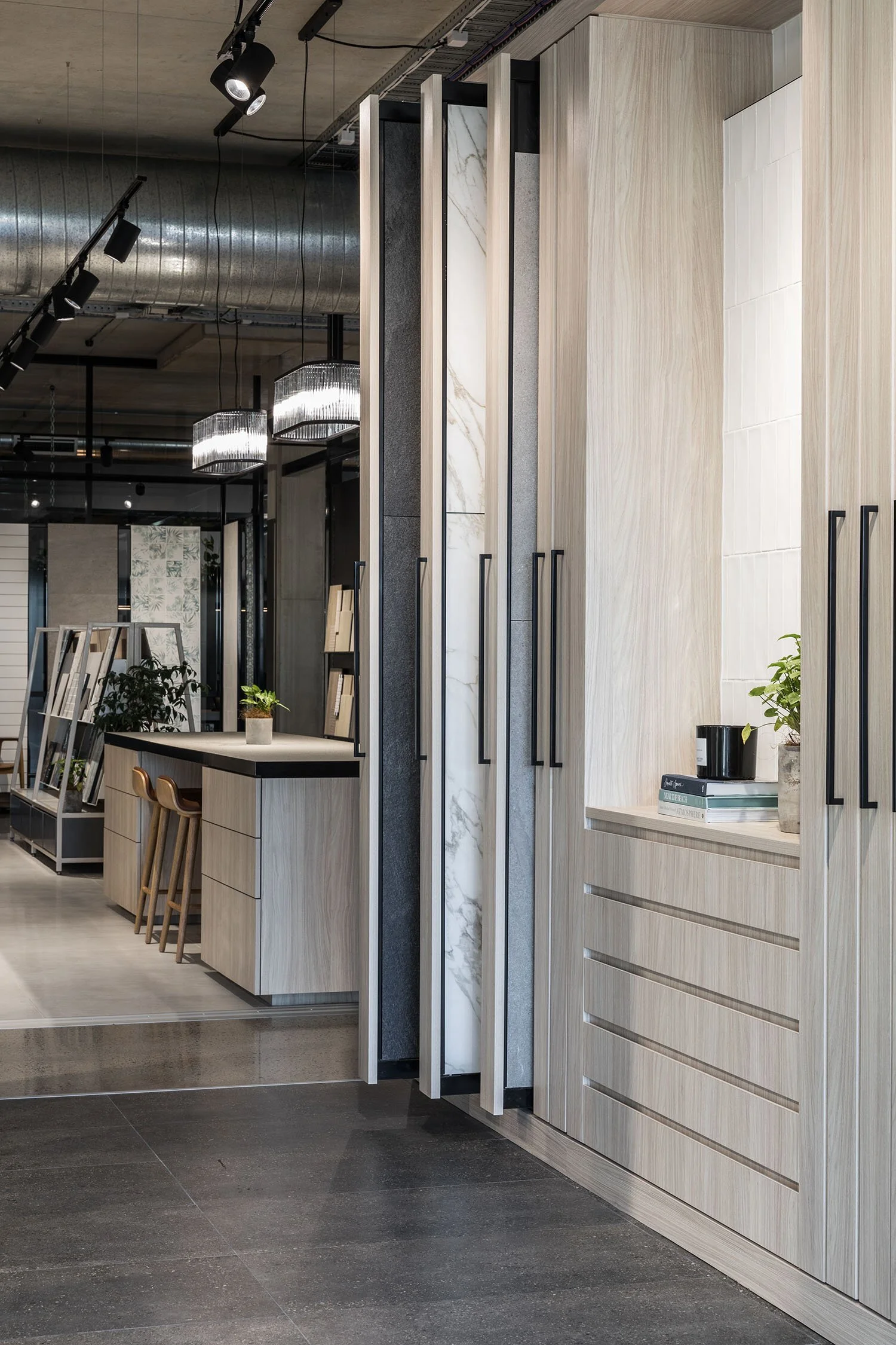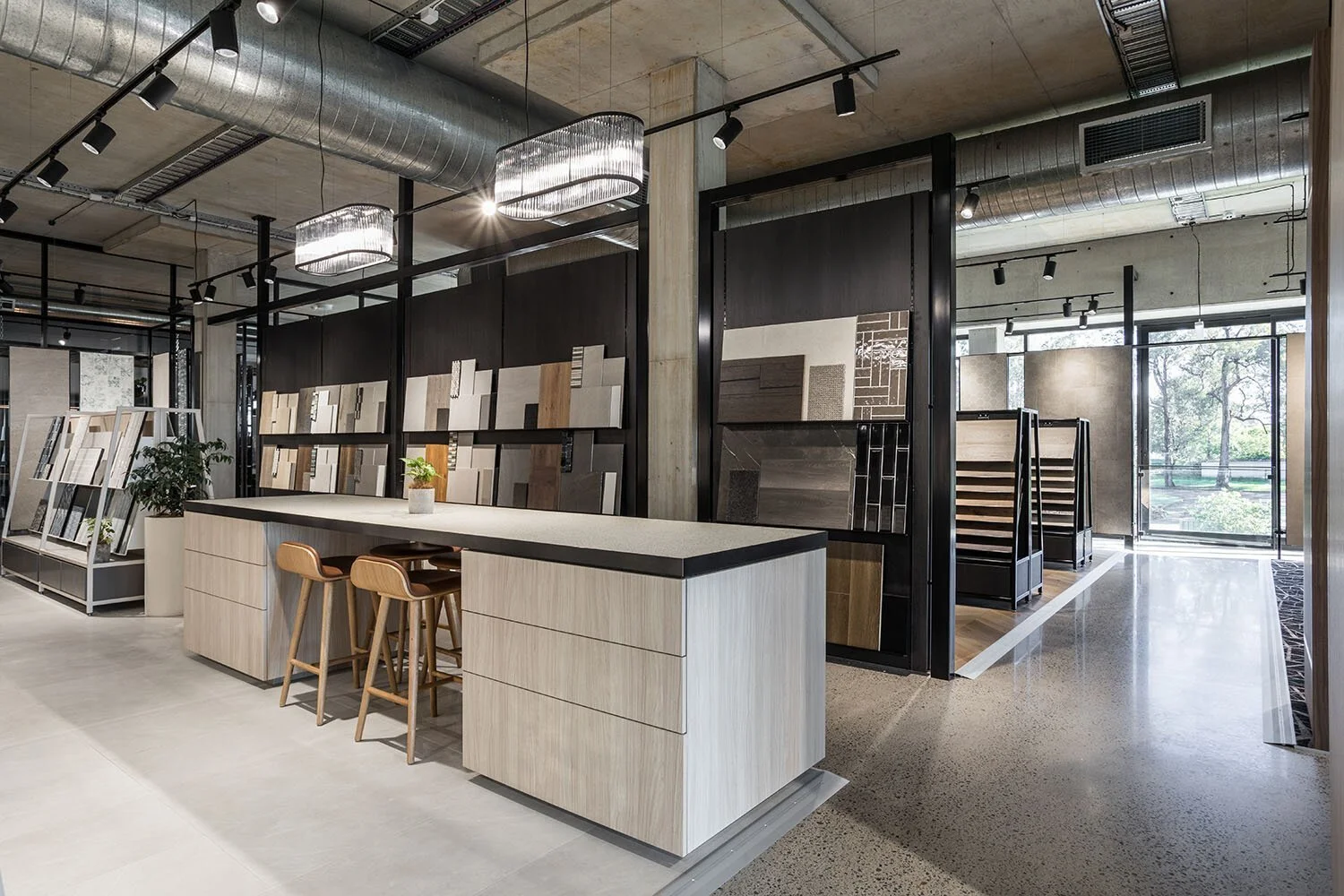 Customer journey mapping and space planning were pivotal as zoning was based ROI and product capacity. By creating an immersive environment that utilises the finishes on offer, spaces included six fully functional bathrooms, kitchens, workspaces and selection rooms were conceived to showcase different styles to showcase products in context.