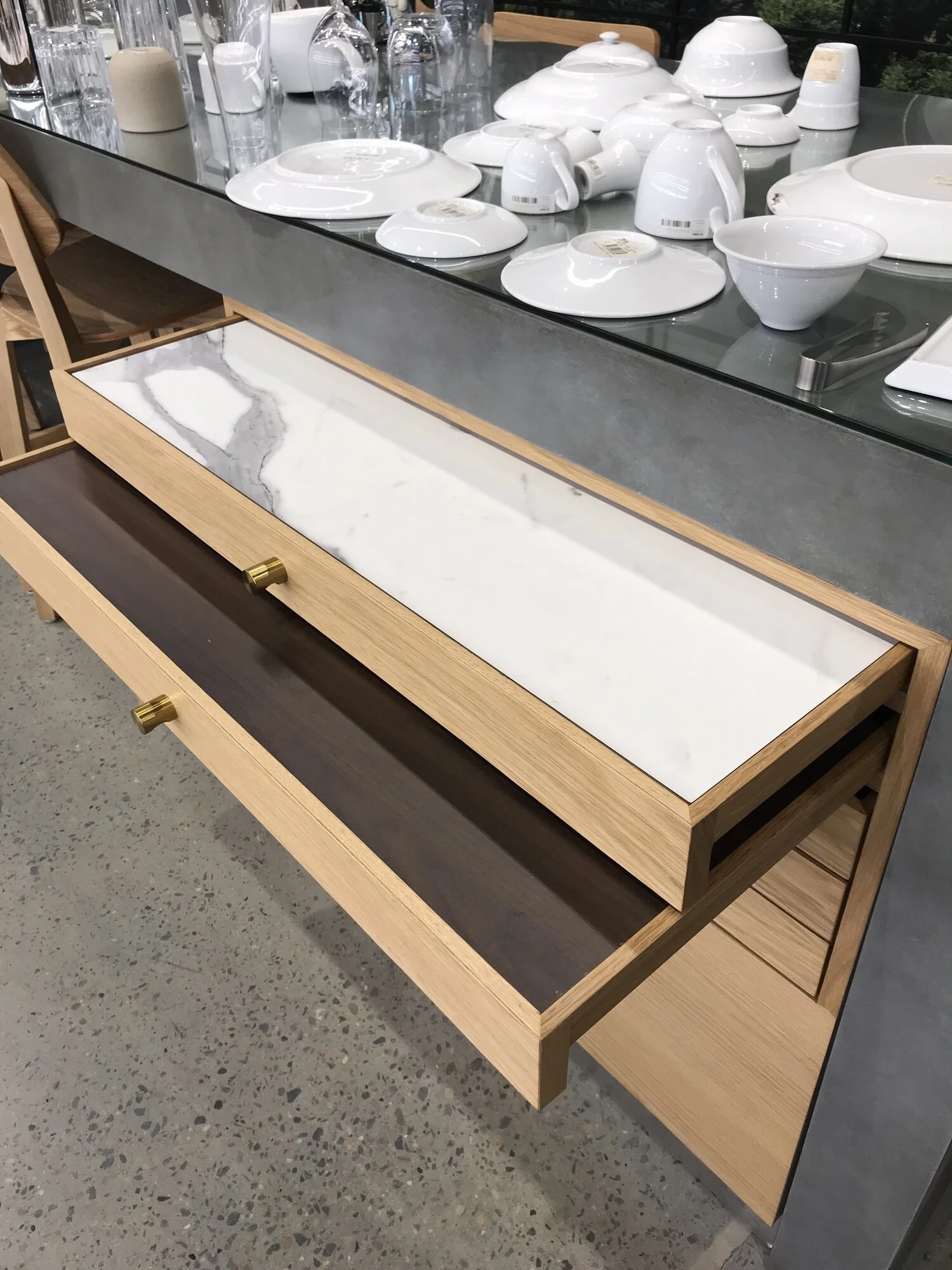 With a wide assortment of products to display, zones were created that demonstrate each brand through the use of fixtures and visual merchandising. In addition to pull out finishes, a large selection table also allows customers to test different table top materials such as timber, stone, and laminate before making their selections. This enabled each product story to be highlighted in an unique manner that engaged and educated customers.